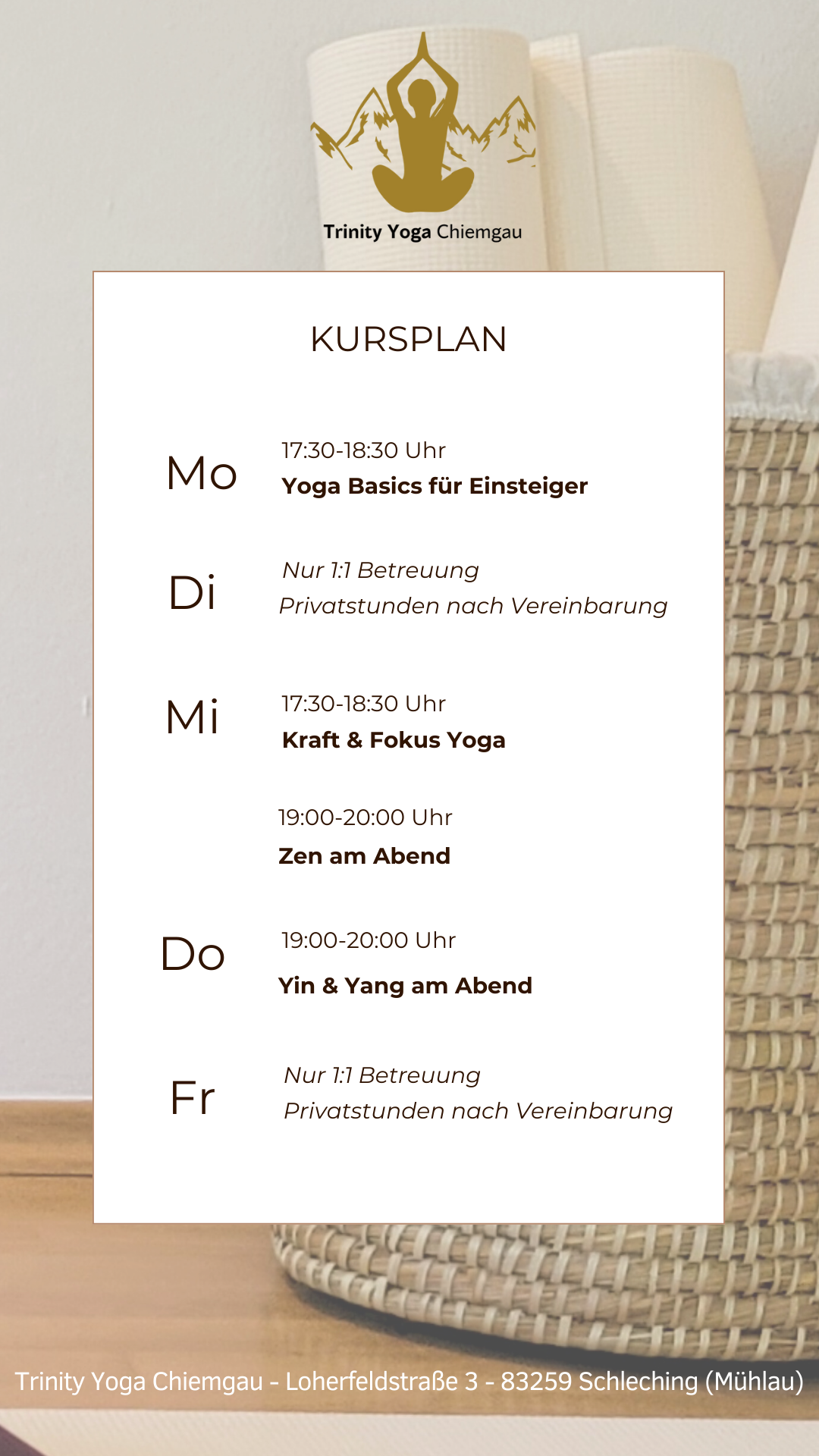 ** Bitte beachte, dass du dich unbedingt voranmelden musst, um sicher eine freie Matte vorzufinden. In meinem sehr persönlichen Kleingruppen-Setting sind die Plätze schnell ausgebucht. Hast du einmal einen, bleibt er dir sicher, wenn du das möchtest **