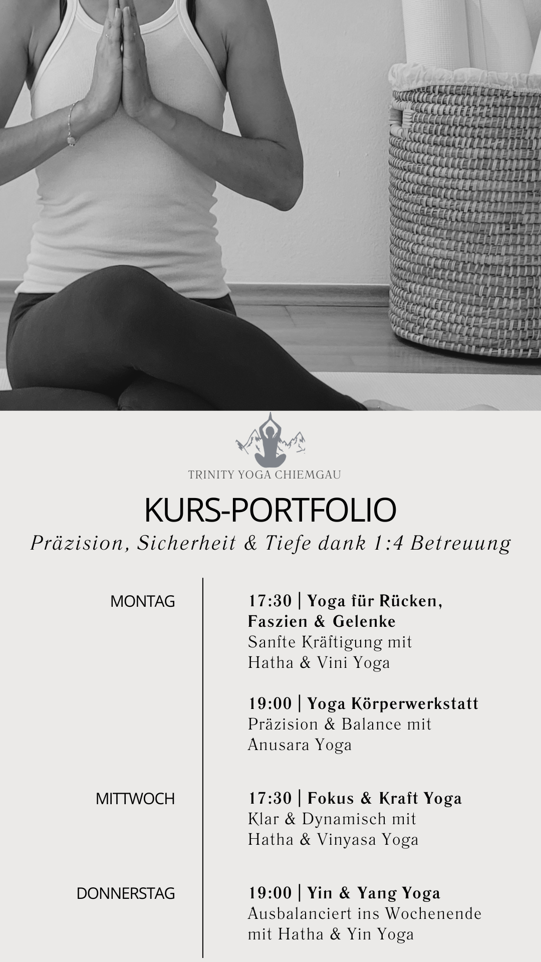 Diese besondere Atmosphäre lädt zum gemeinsamen Bewegen, Entspannen und Wachsen ein - und da ich meine Kleingruppen schon nach kurzer Zeit sehr eng kenne, kann ich immer wieder individuelle Hilfestellungen anbieten und besondere Bedürfnisse optimal berücksichtigen.